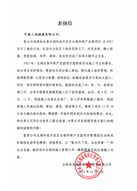 長(zhǎng)春北湖創(chuàng)客空間項(xiàng)目自2025年開(kāi)工以來(lái),優(yōu)化施工策劃、強(qiáng)化組織管理,加大人力、材料、設(shè)備等資源投入,高效完成水電氣熱等外部協(xié)調(diào),在多工序穿插施工的復(fù)雜場(chǎng)景下,順利完成了各主樓綜合機(jī)電、精裝修及市政外網(wǎng)達(dá)到交付標(biāo)準(zhǔn),獲業(yè)主單位表?yè)P(yáng)。