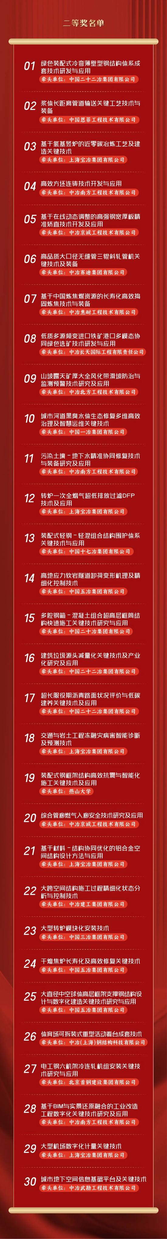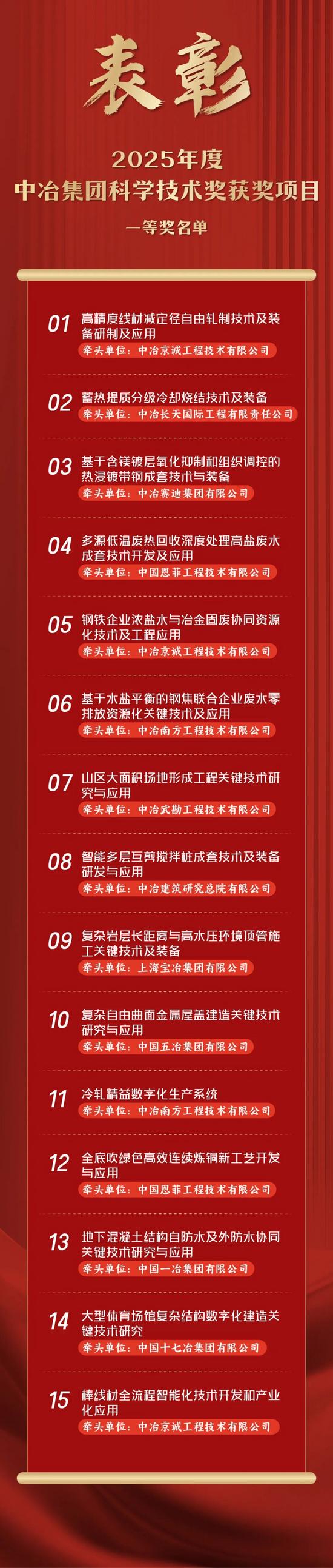 2025年,中國(guó)中冶以習(xí)近平新時(shí)代中國(guó)特色社會(huì)主義思想為指引,貫徹落實(shí)黨的二十大和二十屆歷次全會(huì)精神,踐行“五大核心要義”,錨定“一創(chuàng)兩最五強(qiáng)”奮斗目標(biāo),緊緊圍繞“一核心兩主體五特色”業(yè)務(wù)體系,堅(jiān)持科技創(chuàng)新賦能產(chǎn)業(yè)創(chuàng)新,持續(xù)提升科技成果轉(zhuǎn)化應(yīng)用水平。經(jīng)按照《中冶集團(tuán)科學(xué)技術(shù)獎(jiǎng)獎(jiǎng)勵(lì)管理辦法》嚴(yán)格評(píng)審,決定授予45個(gè)項(xiàng)目為2025年度中冶集團(tuán)科學(xué)技術(shù)獎(jiǎng)獲獎(jiǎng)項(xiàng)目,名單已正式發(fā)布。