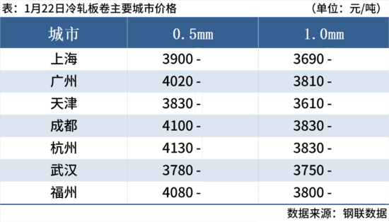 冷軋板卷:1月22日,全國24個主要城市1.0mm冷卷均價3818元/噸,較上一交易日持平。目前商家對后期市場預(yù)期欠佳,普遍采取了“以價換量”的策略,出貨意愿較強(qiáng)。1月22日Mysteel監(jiān)測29個城市庫存,本周冷軋板卷社會庫存218.34萬噸,周環(huán)比減少2.35萬噸,月環(huán)比減少0.87萬噸,庫存小幅去化。短期來看,鋼廠供應(yīng)維持平穩(wěn),但下游家電汽車需求均有減弱,供需矛盾還在持續(xù)累積。綜合來看,預(yù)計23日國內(nèi)冷軋板卷價格或?qū)⒄鹗庍\(yùn)行。