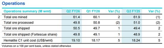 北京時間2026年1月22日,澳大利亞礦業(yè)公司福德士河(Fortescue)發(fā)布2025年第四季度(2026澳大利亞財年Q2)運營報告,報告顯示: