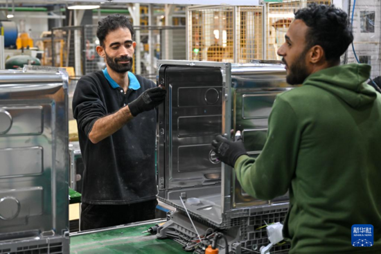 ▲ 1月19日,在埃及蘇赫奈泉的中?!ぬ┻_(dá)蘇伊士經(jīng)貿(mào)合作區(qū),埃及員工在美的埃及廚房和熱水器有限公司洗碗機(jī)生產(chǎn)車(chē)間組裝洗碗機(jī)。新華社記者 辛夢(mèng)晨 攝