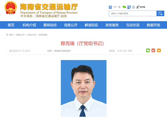 日前,從海南省交通運輸廳官網(wǎng)獲悉,穆克瑞已任海南省交通運輸廳黨組書記,主持海南省交通運輸廳全面工作。