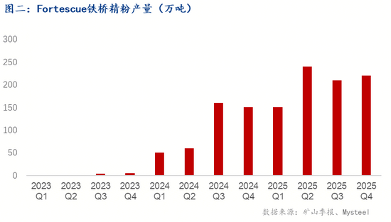 其中,鐵橋項(xiàng)目運(yùn)行平穩(wěn),四季度產(chǎn)量為220萬噸(鐵礦石加工量),環(huán)比增長4.76%,同比增長46.67%。全年來看2025自然年全年產(chǎn)量為820萬噸,同比增長95.24%(圖二)。