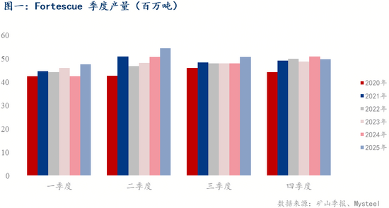 季報(bào)顯示,F(xiàn)ortescue 2025年四季度鐵礦石產(chǎn)量4980萬噸(鐵礦石加工量),環(huán)比下降2%,同比下降2%;全年來看,2025自然年鐵礦石總產(chǎn)量約2.1億噸,同比基本持平,僅小幅下降0.8%(圖一)。
