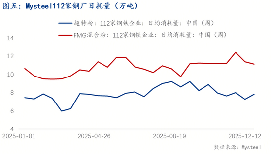 相比之下,混合粉在此期間基本面則表現(xiàn)出一定的韌性。四季度其發(fā)運(yùn)量環(huán)比下降7.65%,至1690萬噸;但需求則小幅回暖,2025年四季度,Mysteel112家鋼廠混合粉的平均日耗量為11.42萬噸,較三季度平均日耗量增長0.85萬噸,增幅為8.04%(圖五)。
