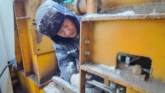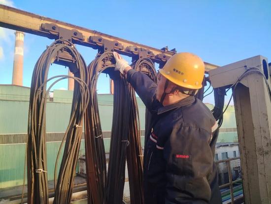 大型總廠吊車(chē)區(qū)域職工在嚴(yán)寒中檢查吊車(chē)鋼繩,筑牢安全防線。