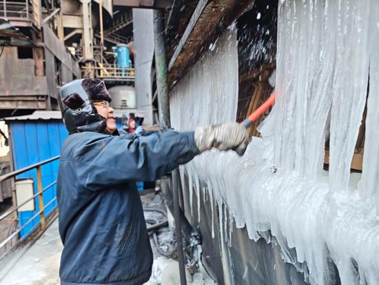煉鐵總廠沖渣作業(yè)區(qū)職工在脫水器區(qū)域清理積冰,確保設(shè)備穩(wěn)定運(yùn)行。
