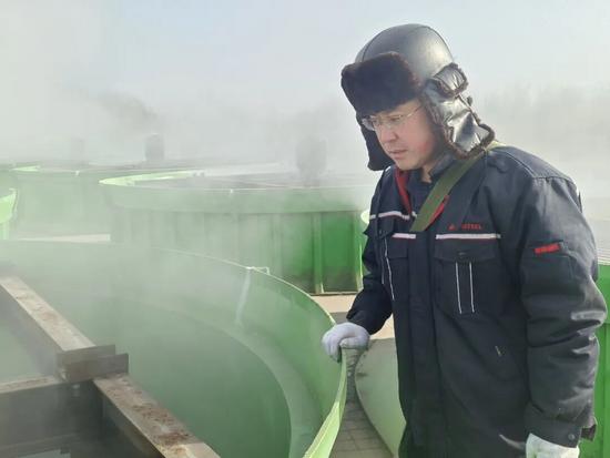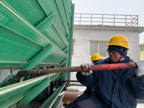線材廠公輔作業(yè)區(qū)職工對(duì)冷卻塔除冰進(jìn)行作業(yè),為軋機(jī)正常運(yùn)行提供保障。