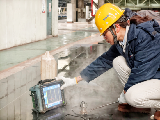 鲅魚(yú)圈分公司厚板部技術(shù)質(zhì)量室職工探傷查微瑕,確保厚板產(chǎn)品質(zhì)量。