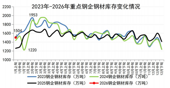 企業(yè)庫存來看,2026月上旬重點鋼企鋼材庫存仍位于近四年歷史同期高位。月上旬,重點統(tǒng)計鋼鐵企業(yè)鋼材庫存量1504萬噸,環(huán)比上一旬增加90萬噸,增長6.4%比上月同旬增加29萬噸,增長2.0%;比去年同旬增加245萬噸,增長19.5%