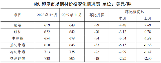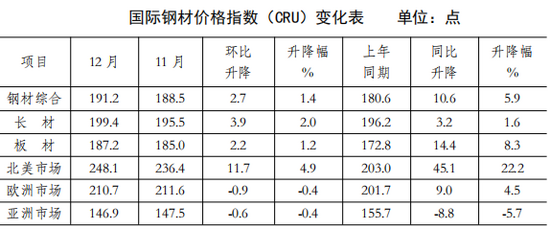 202512月,CRU國際鋼材價格指數(shù)平均值為189.5 點,同比下降8.1點,降幅為4.1%。其中,CRU長材指數(shù)平均值為196.7點,同比下降9.1點,降幅為4.4%CRU板材指數(shù)平均值為185.9點,同比下降7.5點,降幅為3.9 %
