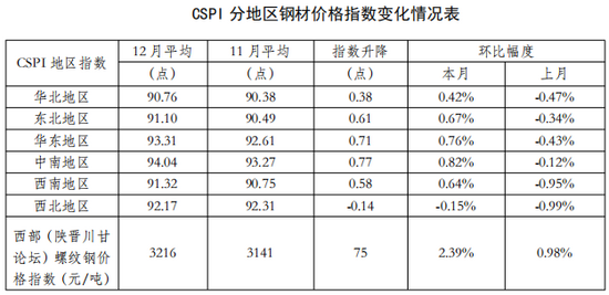 分地區(qū)來看,202512月份,CSPI全國六大地區(qū)鋼材價格指數(shù)平均值環(huán)比呈現(xiàn)“五升一降”特點。其中,升幅較大的為中南地區(qū),升幅為0.82%,西北地區(qū)小幅下降,降幅為0.15%