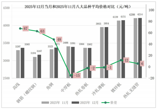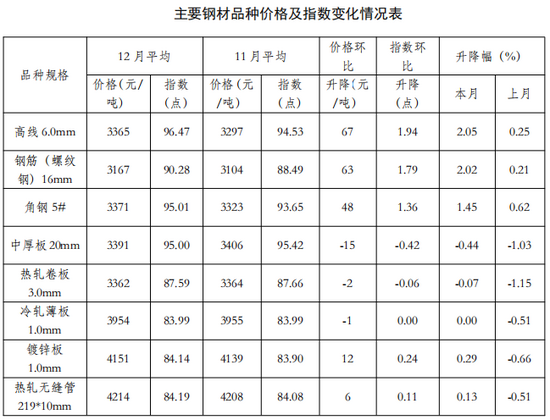 12月份,監(jiān)測的八大鋼材品種平均價格走勢分化較為明顯,長材品種明顯上升,板材走勢分化,管材品種穩(wěn)中有升。長材品種中,高線平均價格上升較大,升67噸,指數(shù)升幅2.05%;板材品種中鍍鋅板平均價格穩(wěn)中有升,中厚板穩(wěn)中有降,其余品種價格平穩(wěn)運行。(見下表)