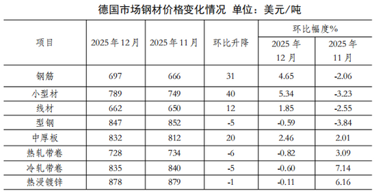 202512月份,CRU歐洲鋼材價格指數(shù)為210.7點,環(huán)比下降0.9 點,降幅為0.4 %;歐元區(qū)12月制造業(yè)PMI終值下滑至48.8,意味著制造業(yè)活動收縮速度加快,主要成員國制造業(yè)PMI下降為主:意大利、德國、西班牙制造業(yè)PMI指數(shù)分別為47.9%47%49.6%,分別降2.71.21.9個百分點,法國制造業(yè)PMI指數(shù)為50.7%,較上月升2.9個百分點。本月德國市場主要鋼材品種價格走勢分化,型鋼、熱軋帶卷、冷軋帶卷穩(wěn)中有降,熱浸鍍鋅平穩(wěn)運行,其余品種價格均上升:線材穩(wěn)中有升小型材升幅較大,為5.34%。(見下表)