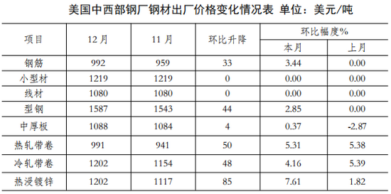 202512月份,CRU北美鋼材價格指數(shù)為248.1 點,環(huán)比上升11.7 點,升幅為4.9 %;美國制造業(yè)PMI47.9%,環(huán)比下降0.3個百分點。本月美國中西部鋼廠鋼材品種價格除小型材、線材、中厚板價格平穩(wěn)運行外其余均上升,其中,熱浸鍍鋅價格升幅較大,為7.61%,型鋼升幅較小,為2.85%(見下表)