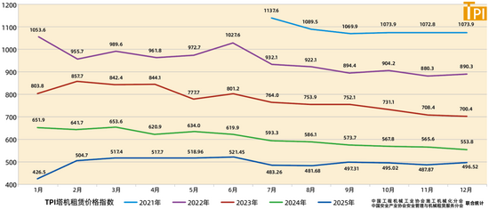 據(jù)中國工程機械工業(yè)協(xié)會施工機械化分會等統(tǒng)計的塔機租賃行業(yè)景氣指數(shù)(TPI),2025年12月份塔機臺天利用率55.1%,最大起重力矩利用率56.8%,分別較上月低2個百分點和1.5個百分點;12月份租賃價格指數(shù)為496.52點,較上月低5.65點,低于去年同期57.283點。