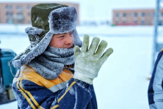 防寒服外層結(jié)了薄冰