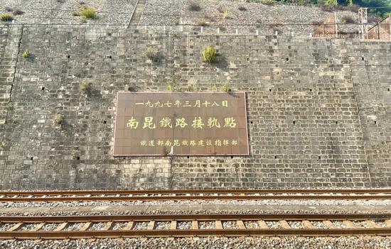 八渡站是南昆鐵路的中點。1997年,南昆鐵路在八渡站接軌點落下最后一節(jié)軌排,南昆鐵路全線勝利鋪通。因此,每位來到八渡站區(qū)的人,第一眼便會望見山坡上那座紀念碑,上面刻著7個醒目大字:南昆鐵路接軌點。這是南昆線賦予八渡的特殊意義。
