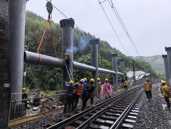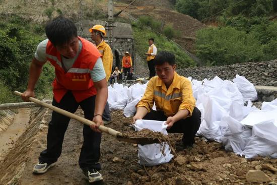 交通中斷,后勤補給難以送達,直到夜里九點,搶險的同志們才吃上當天的第一口飯。那一夜,有人靠裝淤泥的編織袋御寒,有人不眠不休干了個通宵。當現(xiàn)場人員傳來“列車可以限速通過”的消息,大伙兒疲憊的臉上,已分不清是雨還是淚。