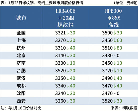 截至1月23日,全國(guó)主要城市20mm三級(jí)抗震螺紋鋼均價(jià)3321元/噸,周環(huán)比跌30元/噸;8.0mmHPB300高線均價(jià)3500元/噸,周環(huán)比跌30元/噸。