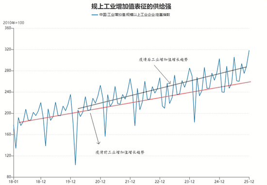 結(jié)合2025年全年特別是12月的實際經(jīng)濟數(shù)據(jù),這種“供強需弱”的圖景具有深刻的意義。一方面,“供給強”的韌性得以驗證。2025年12月,工業(yè)增加值同比增長5.2%,高于市場預(yù)期,其中高技術(shù)制造業(yè)增長尤為突出。這背后是產(chǎn)業(yè)政策持續(xù)發(fā)力、出口(特別是“新三樣”)表現(xiàn)超預(yù)期以及設(shè)備更新改造等政策對生產(chǎn)的直接拉動。另一方面,“需求弱”的疲軟現(xiàn)實同樣被數(shù)據(jù)證實。2025年12月,社會消費品零售總額同比僅增長3.7%,全年呈趨勢性下跌。盡管有低基數(shù)效應(yīng)和以舊換新等政策支持,但復(fù)蘇斜率依然溫和,凸顯居民消費信心和收入預(yù)期修復(fù)緩慢。固定資產(chǎn)投資全年累計增長-3.8%,其中房地產(chǎn)投資深度下滑形成主要拖累,而制造業(yè)和基建投資則相對穩(wěn)健。這種數(shù)據(jù)組合意味著,旺盛的生產(chǎn)能力未能被同樣強勁的終端消費和投資需求有效吸收,形成了“供”持續(xù)強于“求”的宏觀格局。