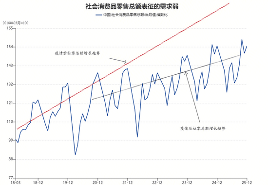 2025年中國經(jīng)濟內(nèi)部供需兩側(cè)的顯著分化與失衡。具體來看,代表供給側(cè)的“規(guī)模以上工業(yè)增加值”指數(shù)全年保持穩(wěn)健上揚態(tài)勢,表明工業(yè)生產(chǎn)端在政策支持與產(chǎn)業(yè)升級驅(qū)動下展現(xiàn)出強勁韌性和充沛活力。與之形成鮮明對比的是,代表需求側(cè)的“社會消費品零售總額”指數(shù)增長曲線極為平緩,甚至出現(xiàn)波動停滯,與供給側(cè)的差距在2025年被進一步拉大。這種直觀的“剪刀差”擴大趨勢,精確量化了當前宏觀經(jīng)濟運行中最核心的結(jié)構(gòu)性矛盾。