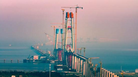 超級工程新進展!杭州灣跨海鐵路大橋首座主塔封頂