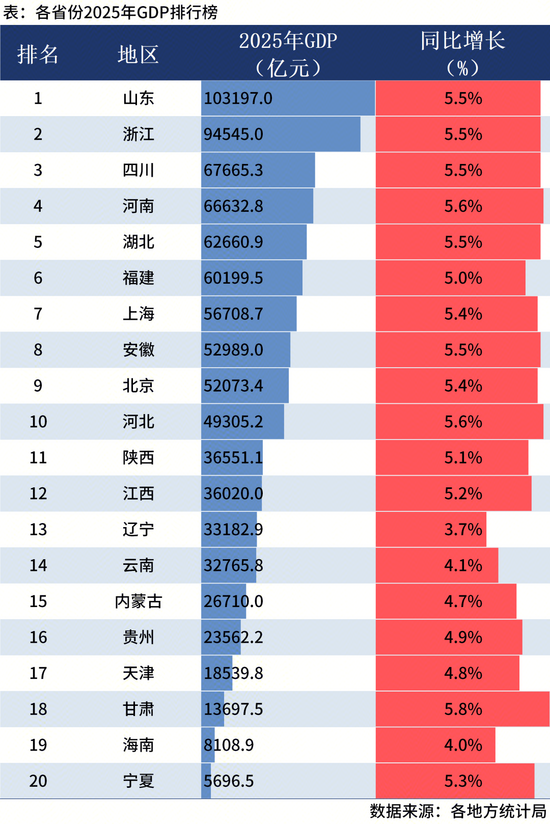 ◎截至1月24日,已有20個省份公布2025年GDP數(shù)據(jù)。從地區(qū)生產(chǎn)總值來看,排名前三的省份暫為山東、浙江和四川,2025年GDP分別為103197.0億元、94545.0億元和67665.3億元。