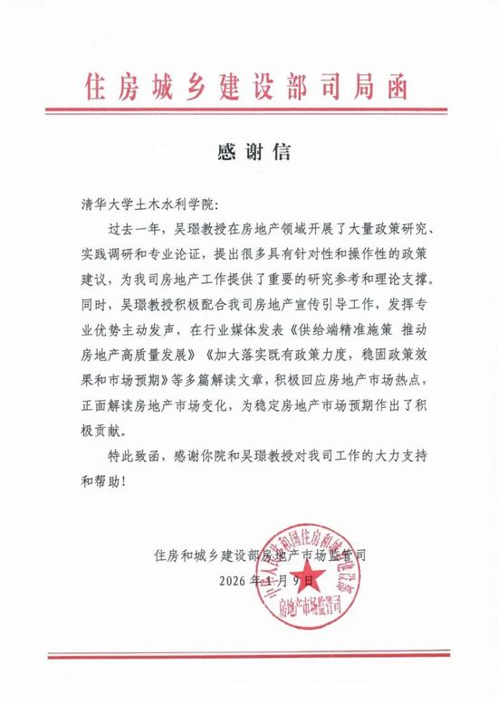 近日,住房和城鄉(xiāng)建設(shè)部房地產(chǎn)市場(chǎng)監(jiān)管司致信清華大學(xué)土木水利學(xué)院,對(duì)我中心主任吳璟教授在房地產(chǎn)領(lǐng)域的專業(yè)貢獻(xiàn)與大力支持給予了高度肯定與誠(chéng)摯感謝。