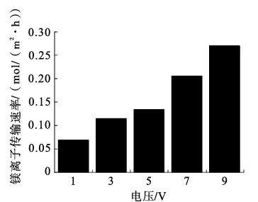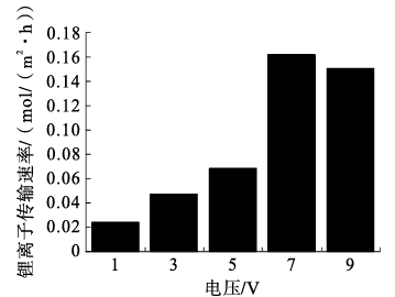 (1)針對試驗(yàn)鹵水的鋰鎂分離選擇性。根據(jù)西臺吉乃爾鹽湖鹵水鋰鎂離子濃度配制試驗(yàn)鹵水,不同電壓條件下二維蒙脫石薄膜的離子分離性能如圖4所示。隨著電壓的增加,鎂離子傳輸速率始終呈現(xiàn)上升的趨勢,而鋰離子傳輸速率呈現(xiàn)先增加后減小的趨勢。當(dāng)電壓設(shè)置為7 V時(shí),薄膜的鋰離子傳輸速率最大,為0.162 mol/(mh),此時(shí)薄膜的鋰鎂分離選擇性可以達(dá)到14.45。