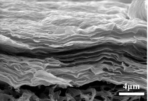 (1)形貌特征。二維蒙脫石納米片刮涂制備的二維蒙脫石薄膜樣品尺寸為4 cm×5 cm。薄膜在大幅度彎折后,不發(fā)生斷裂,有良好的柔韌性和機(jī)械強(qiáng)度。薄膜厚度均在109 μm左右,具有良好的均一性。如圖1所示,薄膜表面具有連續(xù)、致密的片層覆蓋,無可見裂紋或孔洞缺陷,存在細(xì)小褶皺,表面均勻。蒙脫石納米片在底膜表面逐層堆疊,形成了明顯的二維層狀堆疊結(jié)構(gòu)。
