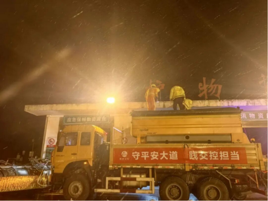 收到強降雪預警后,除雪突擊隊全員24小時待命,依托“路養(yǎng)一體化”機制,立即啟動除雪保通三級應急響應。各養(yǎng)護中心提前將融雪劑、防滑料等應急物資裝車并前置布設至沿線關鍵點位,確保即需即用;各類撒布機、巡查車全面完成檢修調試。