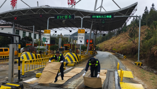 天寶收費所帶溪收費站為防止結冰鋪設防滑麻袋。供圖:江西交投南昌西管理中心