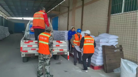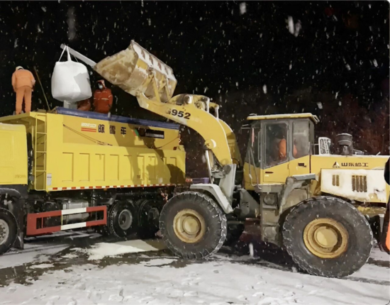 湖北交投鄂西北運營公司:養(yǎng)護巡檢員把融雪劑進行篷布搭蓋防水防潮,確保撒補作業(yè)快速高效。供圖:湖北交投鄂西北運營公司
