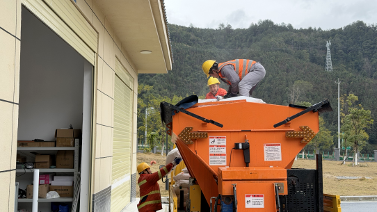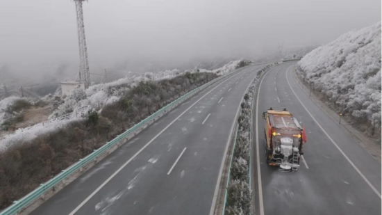 一是強化協(xié)同聯(lián)動,精準掌握險情。公司深化“一路多方”協(xié)同機制,建立信息共享、快速響應工作機制,通過專業(yè)監(jiān)測設備實時捕捉氣溫、濕度、路面溫度等核心數(shù)據(jù),精準預判凝凍發(fā)展趨勢,為應急處置贏得主動。針對高海拔、急彎陡坡、橋梁隧道等凝凍高發(fā)路段,加密巡查頻次,采取常態(tài)化巡查與夜間重點值守相結合的模式,配備無人機開展空中巡查,實現(xiàn)路面狀況全方位、無死角監(jiān)測,確保隱患早發(fā)現(xiàn)、早處置、早清零。二是科技賦能攻堅,提升處置效能。在除冰作業(yè)中,采用“機械為主、人工為輔、科技賦能”的作業(yè)模式,大幅提升除冰效率。新投入的5254型綜合多功能破冰除雪車和1001型Uniqa撒布機成為攻堅利器,與原有設備協(xié)同作戰(zhàn),構建起全方位、高效率的除冰作業(yè)體系。