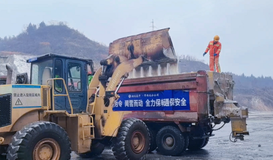 湖北交投鄂西北運營公司養(yǎng)護人員加裝融雪劑。供圖:湖北交投鄂西北運營公司