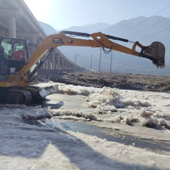 人機協(xié)同攻堅,高效清冰除患。針對不同路段結冰實際情況,采取“機械破冰攻堅、人工清冰收尾”的協(xié)同作業(yè)模式,精準發(fā)力提升清冰打冰實效。對橋梁下方、路面大面積厚冰區(qū)域,操作小型挖掘機以鏟斗精準破碎冰層,快速清除大塊冰體,破除路面結冰“硬障礙”,打通通行關鍵節(jié)點;機械作業(yè)后,養(yǎng)護人員手持鐵鍬、推雪板等工具,對路面殘留碎冰、邊角積冰進行精細化清理,做到不留死角、不存隱患。同時,同步撒布融雪劑、防滑沙,強化路面防滑性能,嚴防二次結冰。針對臨水路段河水漫溢形成的結冰區(qū)域,同步開展河道清淤、破冰疏導作業(yè),疏通水流通道,從源頭遏制結冰隱患反彈。
