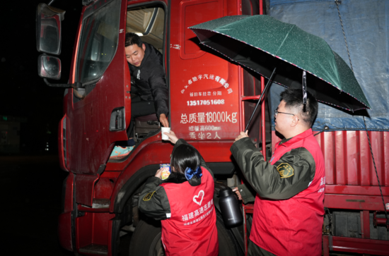 福建高速南平公司志愿者在朱洋服務區(qū)開展志愿服務,為過往司乘免費提供防寒姜茶、暖心泡面、應急藥品等服務,科普低溫雨雪冰凍天氣高速出行注意事項。趙欣奕 攝