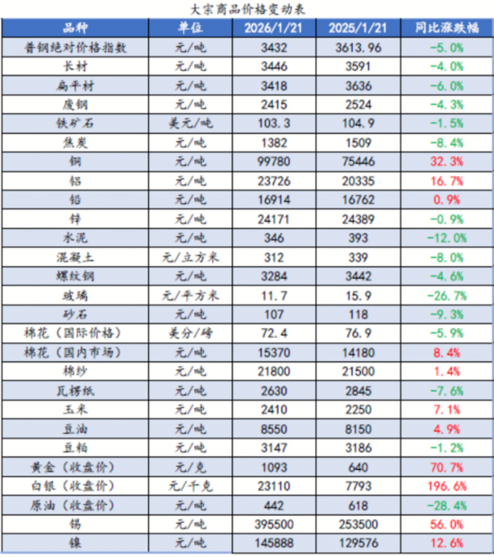 我的鋼鐵網(wǎng):近一年來,全球大宗商品市場迎來一輪強(qiáng)勢輪動(dòng)上漲行情,貴金屬、有色金屬領(lǐng)漲,能源、農(nóng)產(chǎn)品逐步跟進(jìn)。截至2026年1月21日,滬金指數(shù)合約收盤價(jià)1093元/噸,持續(xù)創(chuàng)新高,年同比上漲70.7%;滬銀指數(shù)合約收盤價(jià)23110元/噸,年同比上漲196%;滬銅價(jià)格突破10萬大關(guān),錫價(jià)突破40萬元,鋁價(jià)亦創(chuàng)下歷史新高。本輪大宗商品上漲主要驅(qū)動(dòng)力有流動(dòng)性泛濫、貨幣信用弱化、復(fù)蘇與通脹預(yù)期疊加、工業(yè)金屬供需失衡等四大核心要素,輪動(dòng)順序則呈現(xiàn)“貴金屬-工業(yè)金屬-能源-農(nóng)產(chǎn)品”。