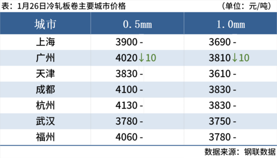 冷軋板卷:1月26日,全國(guó)24個(gè)主要城市1.0mm冷卷均價(jià)3817元/噸,較上一交易日持平。貿(mào)易商反饋市場(chǎng)需求一般,再加上處于傳統(tǒng)淡季的雙重壓力下,部分商家會(huì)通過(guò)暗降來(lái)提高成交量,日內(nèi)整體成交表現(xiàn)尚可。終端消費(fèi)減弱而供應(yīng)持續(xù)相對(duì)高位,臨近月底,各大鋼廠發(fā)貨速度加快,累庫(kù)周期或?qū)㈤_(kāi)始,另外據(jù)了解下游加工中心多于2月初準(zhǔn)備放假,商家對(duì)后市持謹(jǐn)慎態(tài)度。27日全國(guó)冷軋板卷價(jià)格窄幅震蕩運(yùn)行
