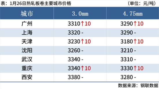 熱軋板卷:1月26日,全國(guó)24個(gè)主要城市4.75mm熱軋板卷均價(jià)3304元/噸,較上一交易日上漲3元/噸。商家持觀望態(tài)度,市場(chǎng)仍以保出貨為主。目前,淡季需求正持續(xù)深化,內(nèi)需拖累仍然明顯,宏觀及產(chǎn)業(yè)預(yù)期時(shí)有擾動(dòng),需求預(yù)計(jì)延續(xù)弱勢(shì)。從供應(yīng)來(lái)看,淡季深入,終端需求面臨逐步下行困境,市場(chǎng)成交仍表現(xiàn)欠佳,供應(yīng)端整體增產(chǎn)動(dòng)力不足。預(yù)計(jì)27日熱軋板卷價(jià)格或?qū)②吶踹\(yùn)行