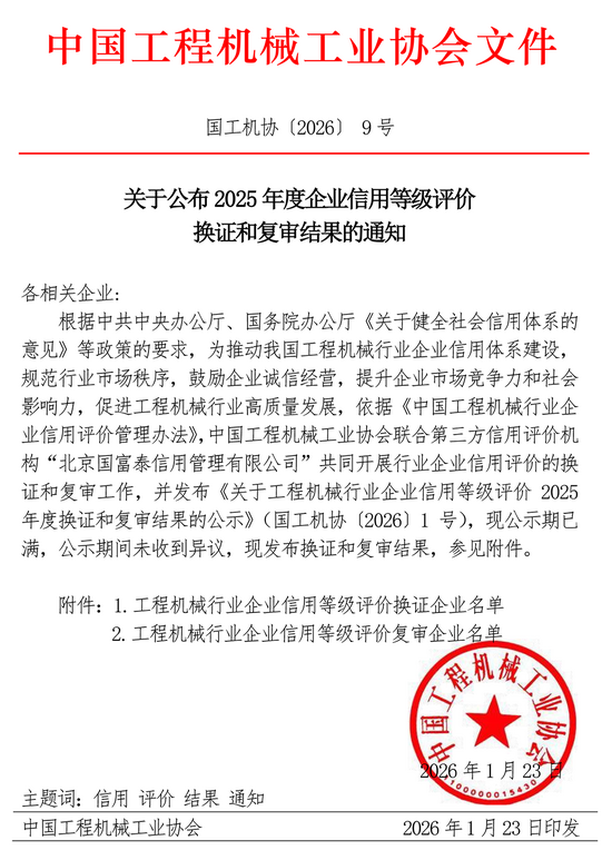 根據(jù)中共中央辦公廳、國(guó)務(wù)院辦公廳《關(guān)于健全社會(huì)信用體系的意見》等政策的要求,為推動(dòng)我國(guó)工程機(jī)械行業(yè)企業(yè)信用體系建設(shè),規(guī)范行業(yè)市場(chǎng)秩序,鼓勵(lì)企業(yè)誠(chéng)信經(jīng)營(yíng),提升企業(yè)市場(chǎng)競(jìng)爭(zhēng)力和社會(huì)影響力,促進(jìn)工程機(jī)械行業(yè)高質(zhì)量發(fā)展,依據(jù)《中國(guó)工程機(jī)械行業(yè)企業(yè)信用評(píng)價(jià)管理辦法》,中國(guó)工程機(jī)械工業(yè)協(xié)會(huì)聯(lián)合第三方信用評(píng)價(jià)機(jī)構(gòu)“北京國(guó)富泰信用管理有限公司”共同開展行業(yè)企業(yè)信用評(píng)價(jià)的換證和復(fù)審工作,并發(fā)布《關(guān)于工程機(jī)械行業(yè)企業(yè)信用等級(jí)評(píng)價(jià)2025年度換證和復(fù)審結(jié)果的公示》(國(guó)工機(jī)協(xié)(2026)1號(hào)),現(xiàn)公示期已滿,公示期間未收到異議,現(xiàn)發(fā)布換證和復(fù)審結(jié)果,參見附件。