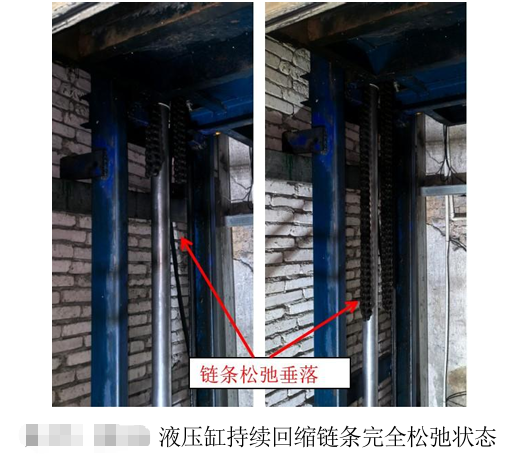 2.涉事液壓升降設(shè)備缺少必要的安全保護裝置,未設(shè)置防墜落裝置、防松鏈保護裝置和液壓缸柱塞異?;乜s保護裝置。