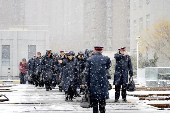 鄭州客運(yùn)段列車乘務(wù)員冒雪出乘。楊昆 攝