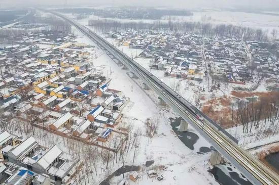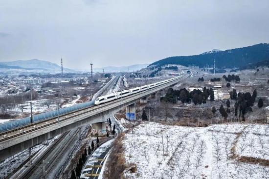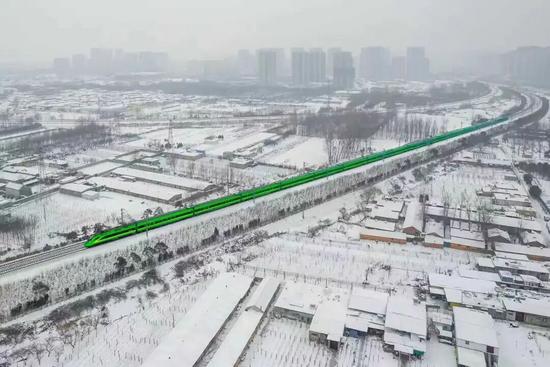 復(fù)興號(hào)駛過白雪覆蓋的村莊,向遠(yuǎn)方飛馳。馬星魁 攝