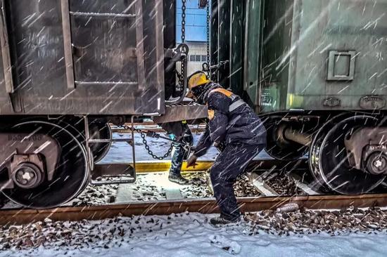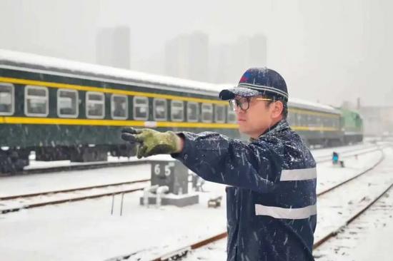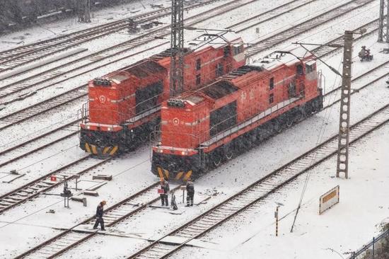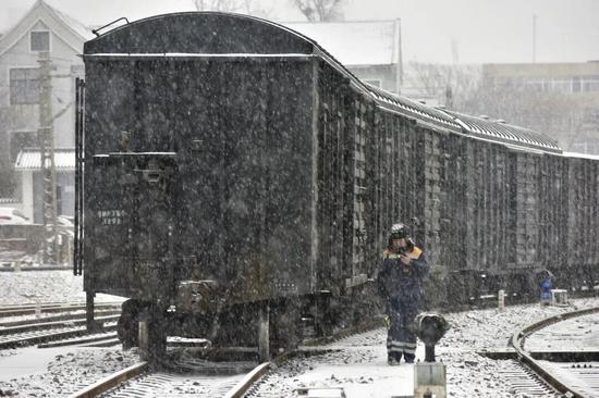 洛陽(yáng)車務(wù)段滎陽(yáng)站連結(jié)員在雪中進(jìn)行調(diào)車作業(yè)。任偉峰 攝