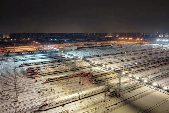 大雪過后,鄭州動(dòng)車段鄭州東動(dòng)車所存車場(chǎng)上,“陸地航母”披上了厚厚的“雪被”。崔軒豪 攝