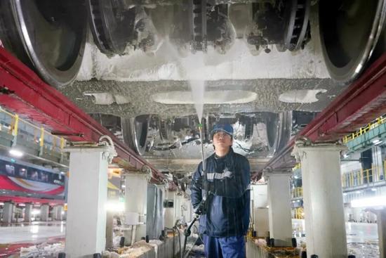 鄭州動(dòng)車段動(dòng)車組機(jī)械師在檢修地溝內(nèi),利用高壓水槍清理車底冰雪。施維翔 攝