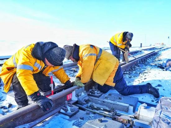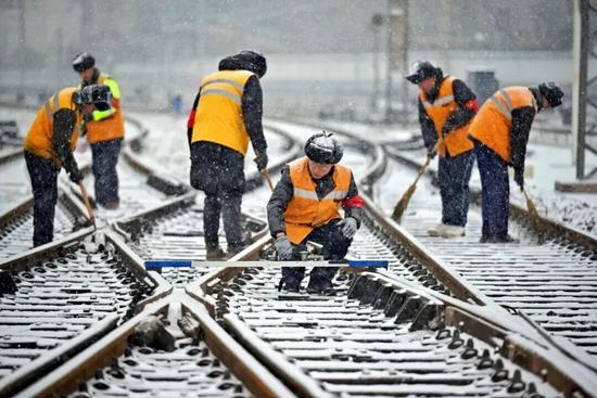 鄭州橋工段線路工在雪中檢查鄭州站的線路、道岔設(shè)備。王瑋 攝