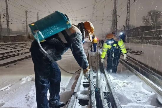 鄭州電務(wù)段信號(hào)工用鼓風(fēng)機(jī)清除中原站道岔轉(zhuǎn)轍設(shè)備積雪。王鵬 攝